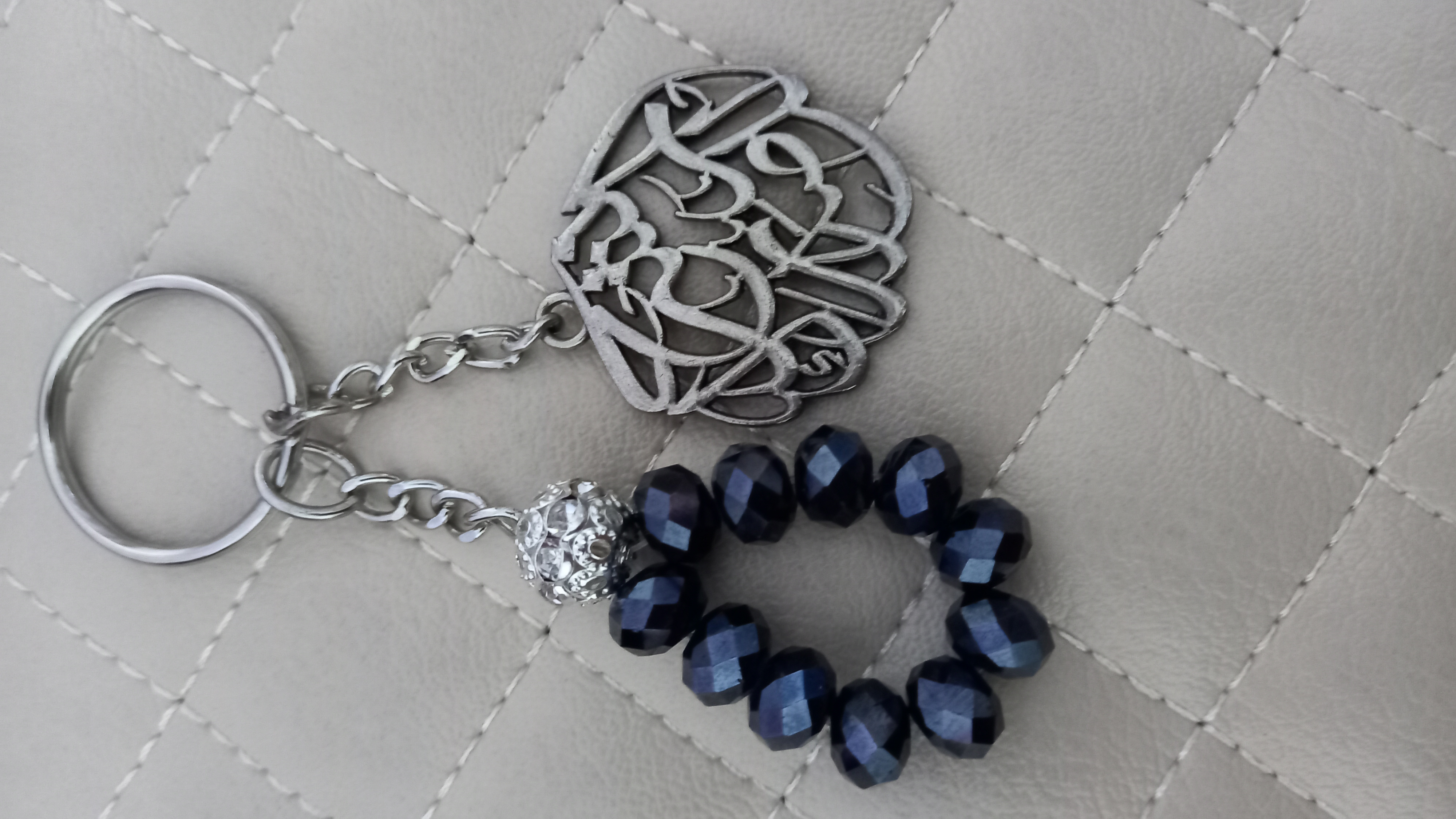 مدالية سبحة صغيرة من خرز الكرستال ومضاف لها قطعة معدنية محفورة ب اية قرأنية